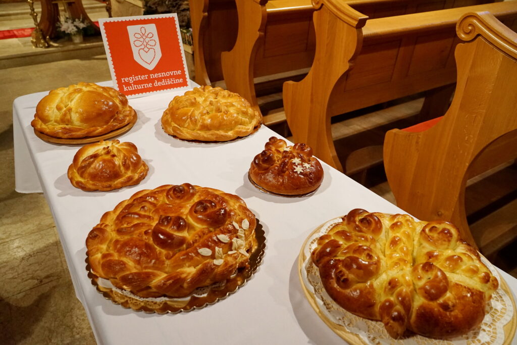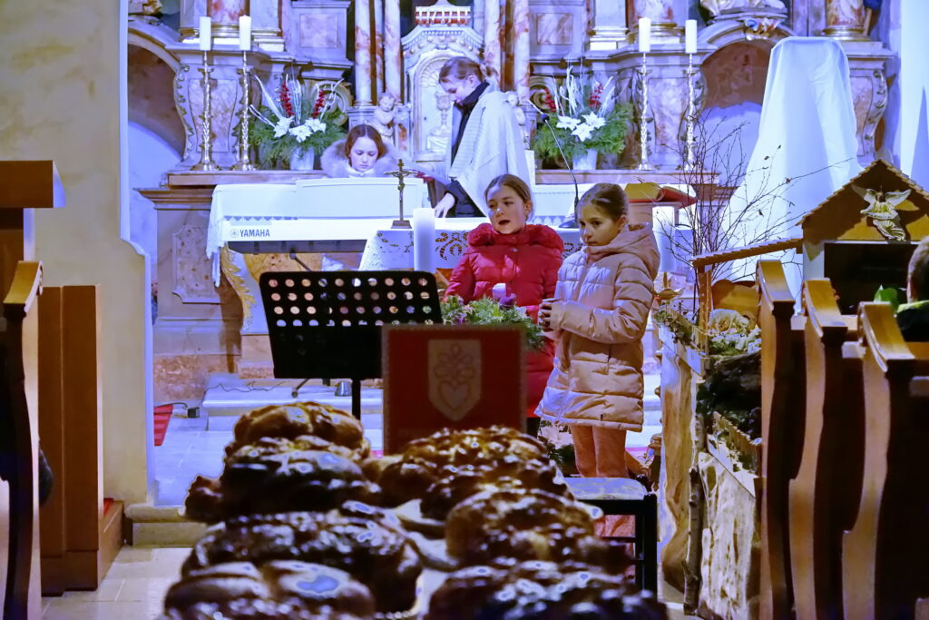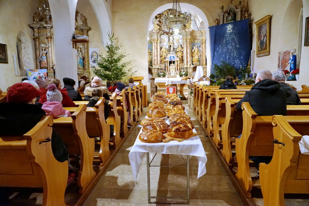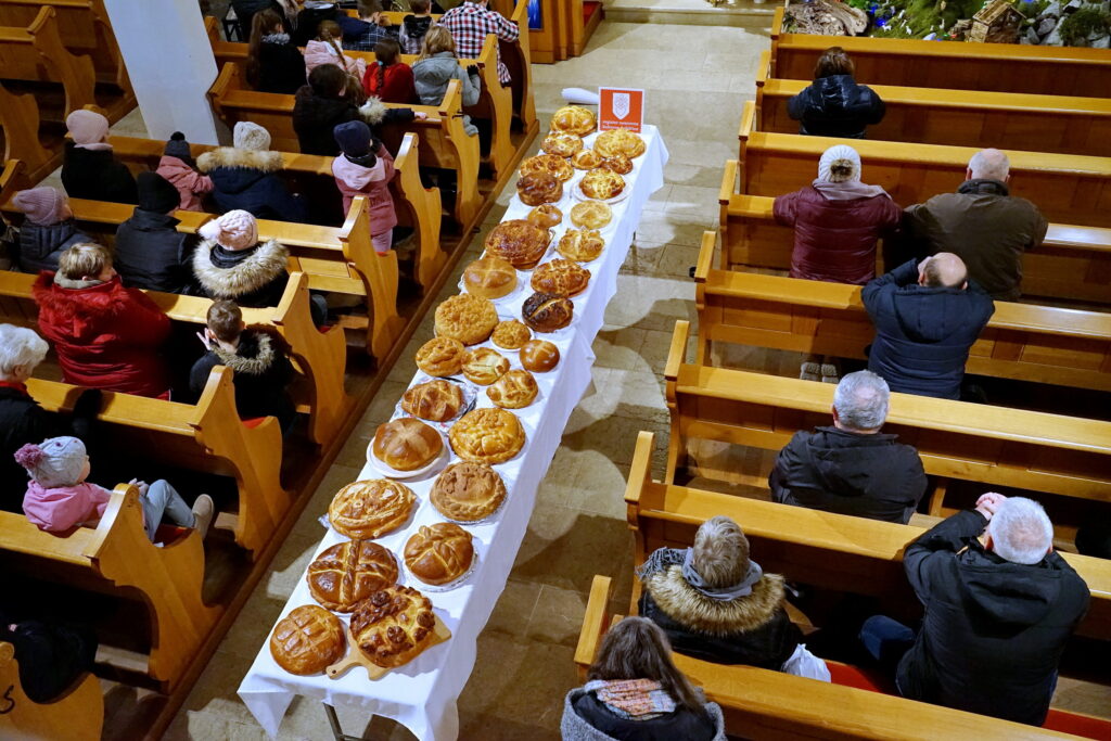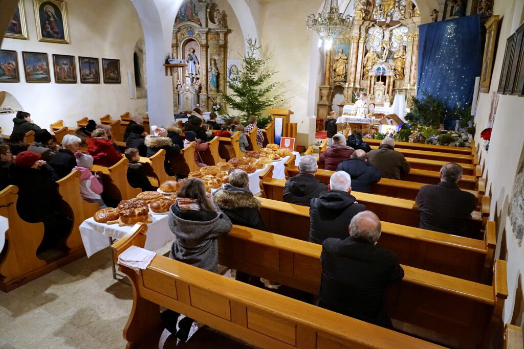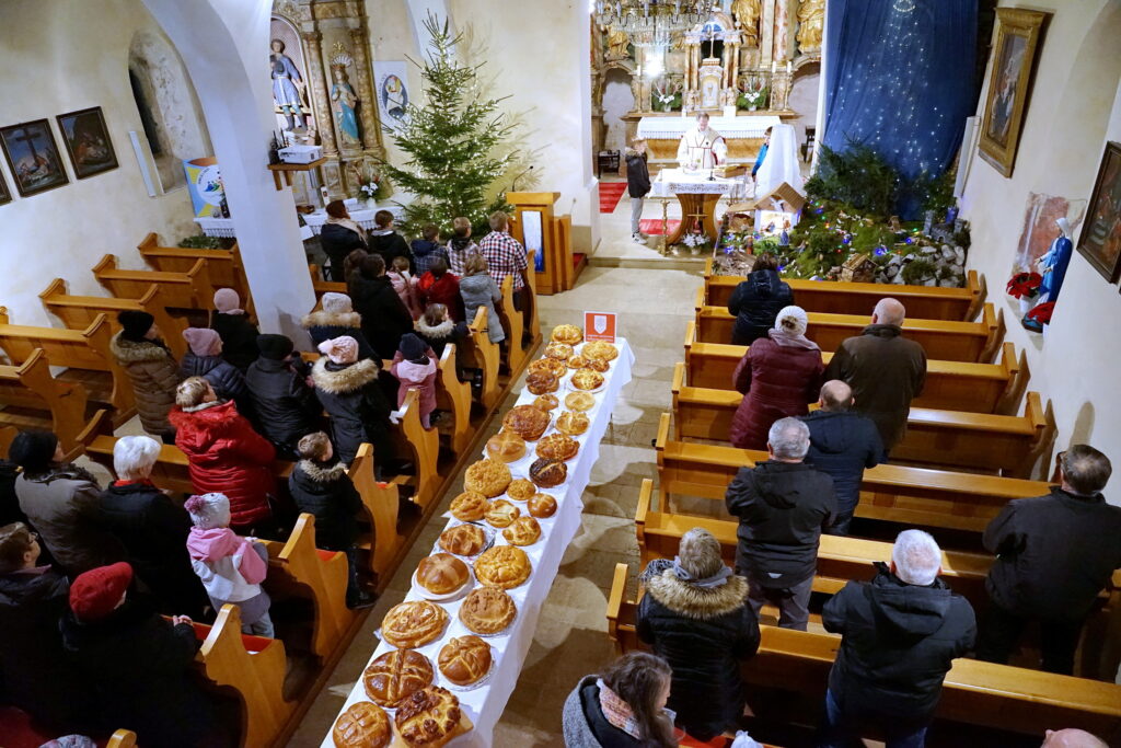 Poprtnik k blagoslovu in na razstavo v župnijski cerkvi Povišanja sv. Križa prinašajo na praznik svetih treh kraljev od leta 2017. Tako je bilo tudi na tretji sveti večer, 5. januarja, ko so v župnijski cerkvi naše ustvarjalne gospodinje razstavile 30 poprtnikov, različno okrašenih, oblike in velikosti, se udeležile maše in otroške božičnice. Župnik Janez Jasenc je nato tudi blagoslovil božični kruh. Tako je še bolj praznično zadišalo v svetišču in nenazadnje tudi po naših domovih v blagoslov vsem njihovim prebivalcem. Navzoči otroci pa so skakali kvišku za dvignjenimi kosi poprtnika, da bi čimbolj zrasli letos. Župnik Janez Jasenc se je ženam in možem zahvalil za peko in prinos v cerkev.