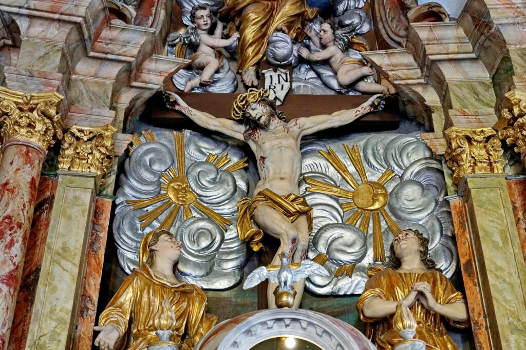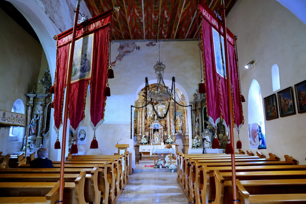 Od opreme v cerkvi so največjega pomena baročni glavni oltar sv. Križa, na stranskem oltarju gotska Sočutna iz okoli 1415, zgodnjebaročna podoba sv. Notburge, v baročni tradiciji na platnu naslikan križev pot, glažutarski lestenec, freskirana krstilnica, zakristijska vrata iz turških ščitov, v zvoniku mali bronastizvon iz leta 1712. Cerkev je bila v celoti obnovljena leta 1995, podporni pokopališki zid na zahodni strani leta 2008. V letih 2010/12 je dobila nove klopi, tlak, razsvetljavo in ozvočenje, spovednico, daritveni oltar in ambon ter belež notranjščine. Dostojno obnovljeno svetišče predstavlja najlepšo izkaznico in razglednico župnije in kraja.